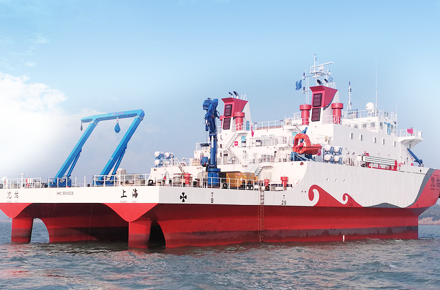 沈括號科學調查作業船,采用S-DE柴電電力推進系統,雙體小水線面設計,2200T科考船,是中國首個直流組網電力推進船舶。