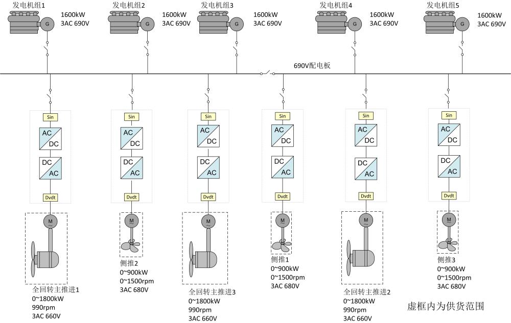 賽思億為1200T海上風電安裝船提供的電力推進系統主要包括:3臺艏側推變頻器、3臺艉推進變頻器、3臺艏側推電機和3臺艉側推電機、舵槳和遙控等。 賽思億核心變頻器具有CCS、RINA、BV三大船級社型式認證,已廣泛應用于直流組網電力推進、交流組網電力推進、軸帶混合動力和岸電變頻電源等場景中,該風電施工平臺是國產變頻在海上風電領域的再次應用。