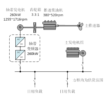 賽思億為南峰01散貨船提供的軸帶發電系統,采用中速機自由端連接齒輪箱的連接方式,帶動軸帶發電機通過賽思億自主研發的AFE有源前端變頻器輸出穩頻穩壓質量穩定可靠的電源,利用主機冗余功率發電,以滿足船舶航行過程中全船的用電負荷,并關停主發電機組,達到節約燃油消耗、降低船舶運行成本的目的。