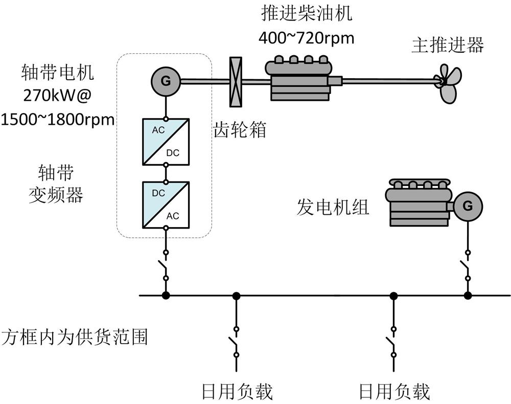 6000DWT瀝青船,采用賽思億S-Hybrid混合動力系統,具有穩定可靠、電源品質高、性價比高等優勢,相比于全電力推進系統,初始投資小,在不改變船舶原有主機動力形式的前提下,充分利用船舶在遠洋航線的經濟航速工況,系統通過主機冗余功率帶動異步電機發電運行,在提高主機負荷率改善其油耗的同時,可以關停船舶輔機,節省了船舶的運營油耗。