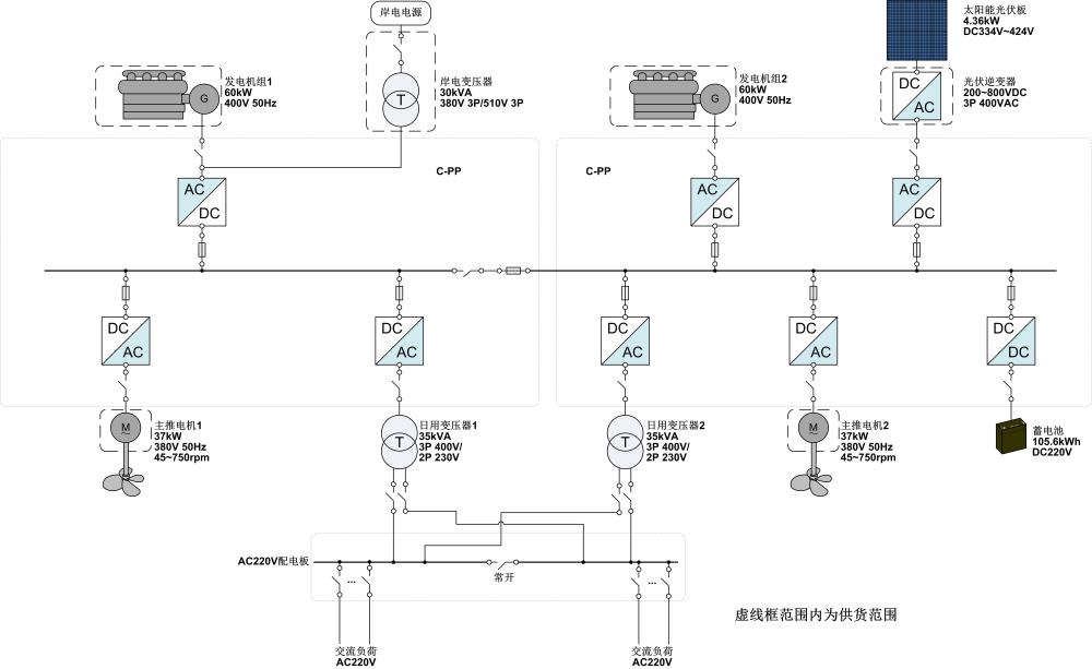 批量四海風行豪華游艇,整個動力系統配置2臺60kW的柴油機組、一套4.6kW的太陽能光伏板、一組105.6kWh的蓄電池組和2臺37kW的主推進電機。在觀光工況下,發電機組停止工作,使用蓄電池和太陽能為全船供電,可使用蓄電池組連續推進5小時左右,零排放、振動噪音小并且船員舒適性較好。